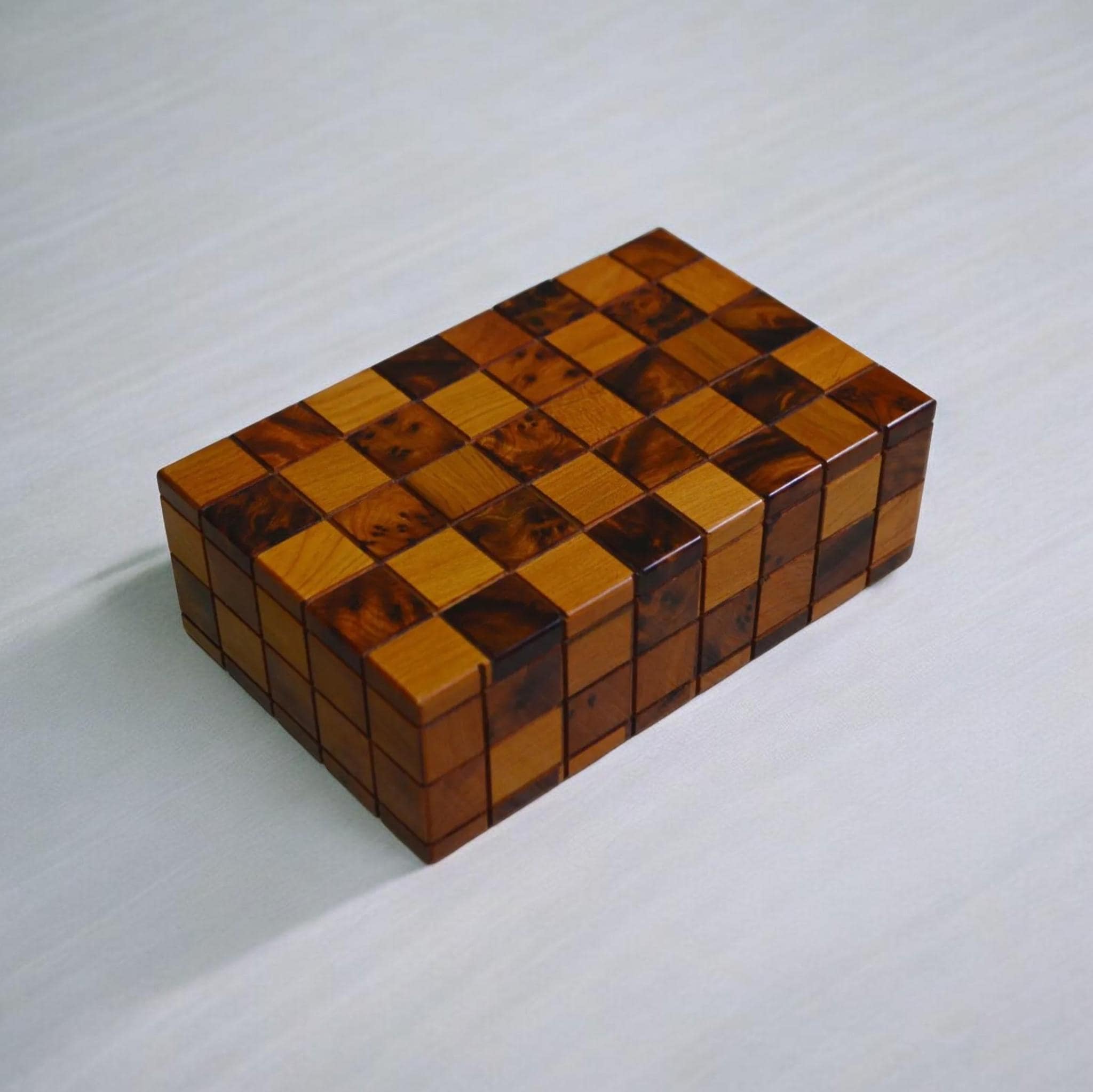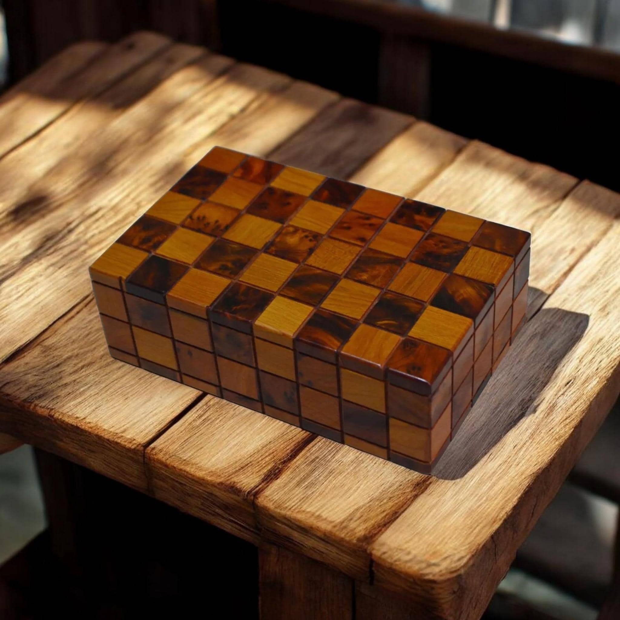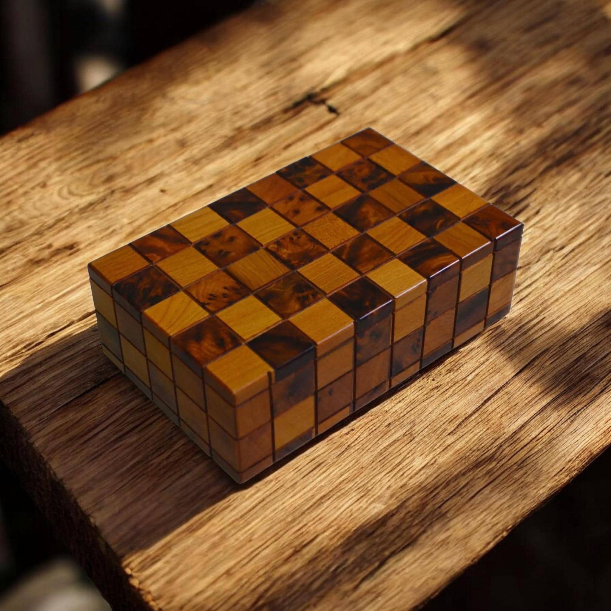 Each square is hand-cut, polished, and assembled — no two boxes are identical due to the unique grain patterns of natural wood.
