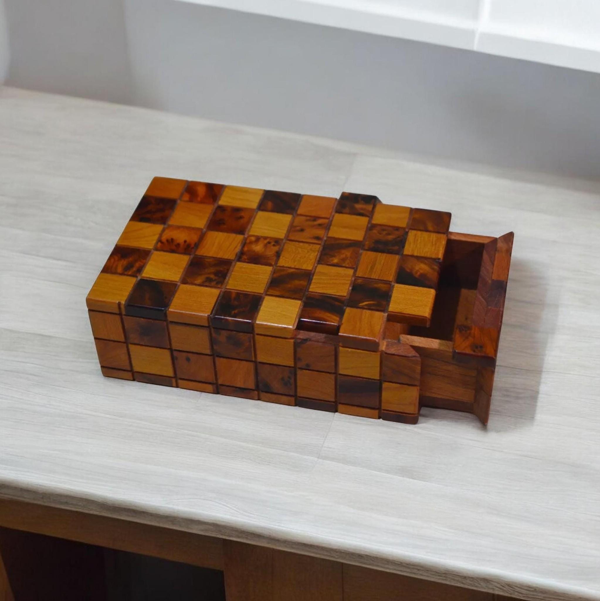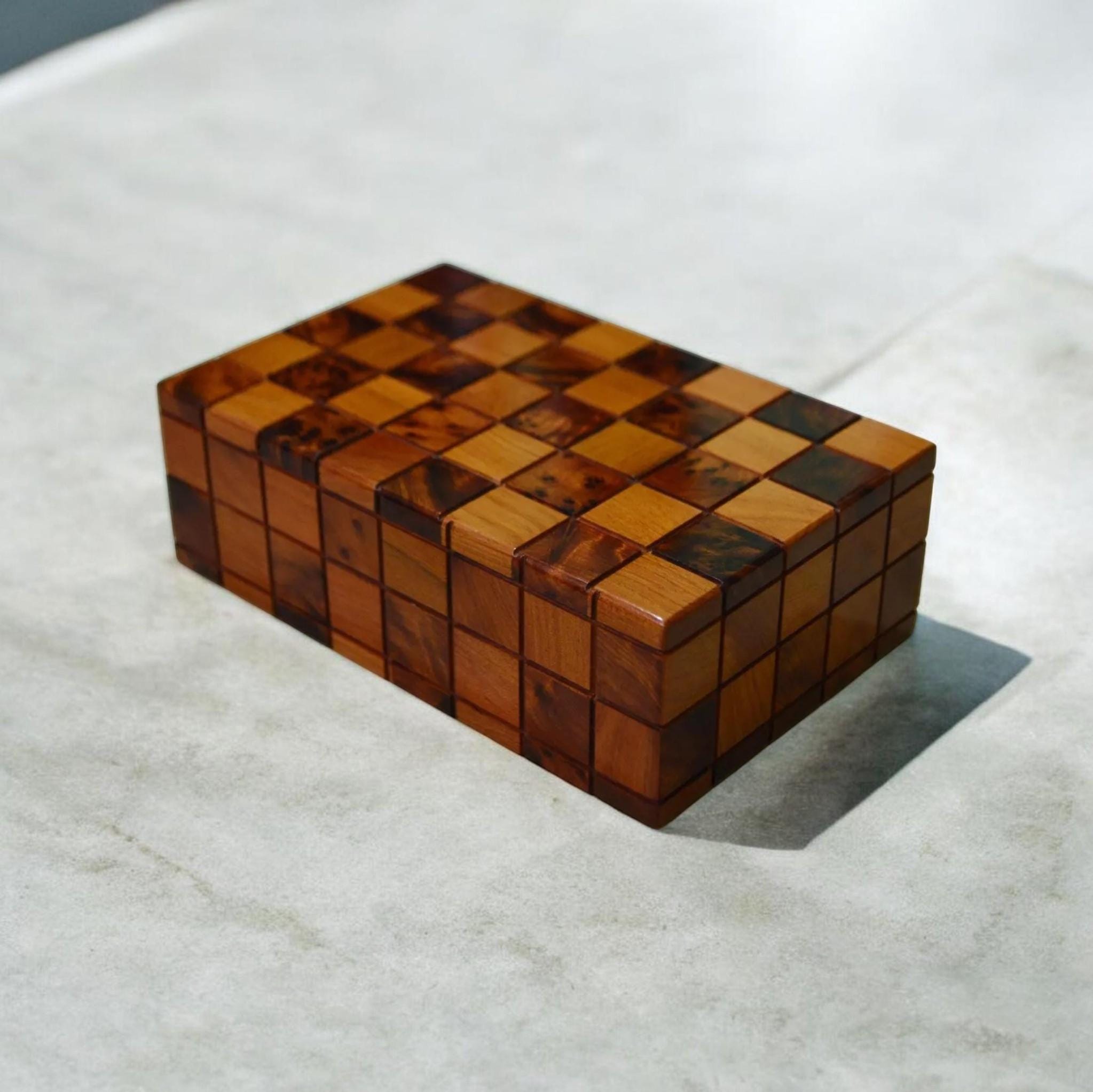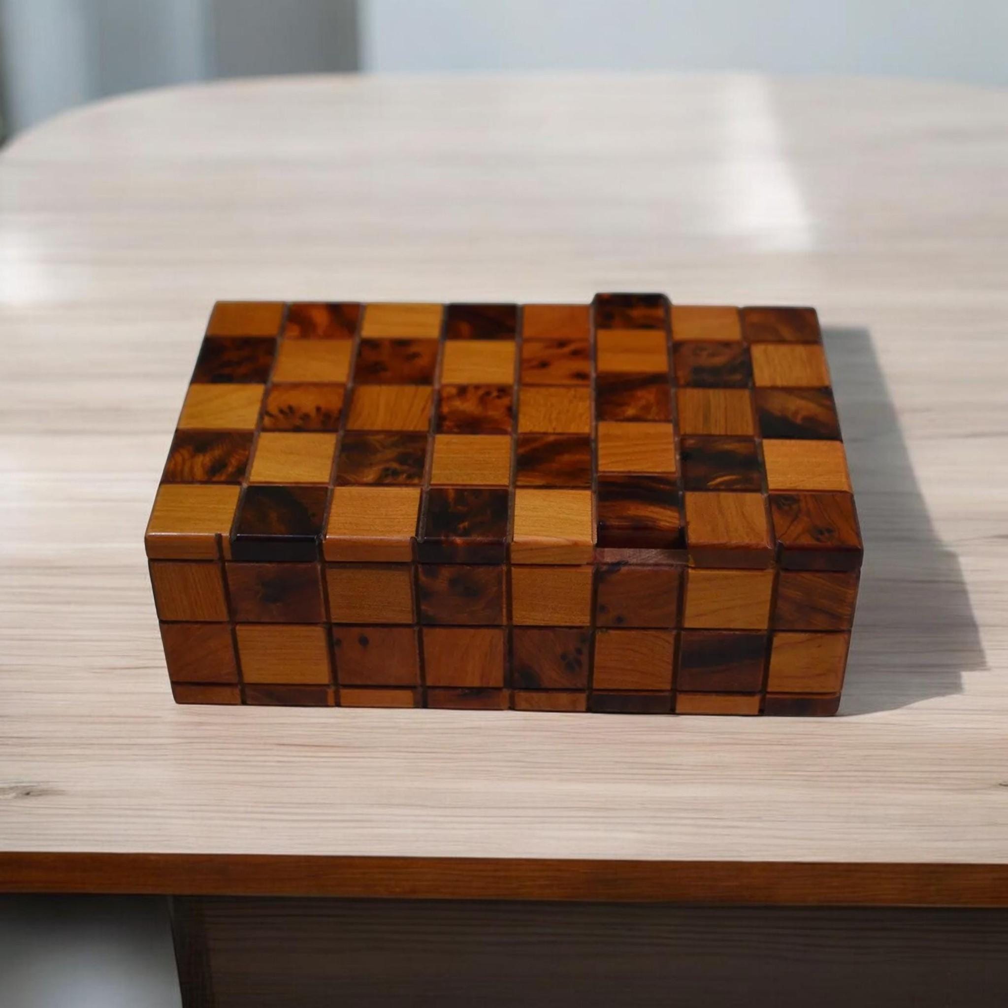 ✨ Handcrafted Moroccan Thuya Burl Wood Box with Checkerboard Pattern — a stunning two-tone design featuring contrasting Thuya burl and natural cedar woods, individually shaped by master artisans in Essaouira, Morocco.
