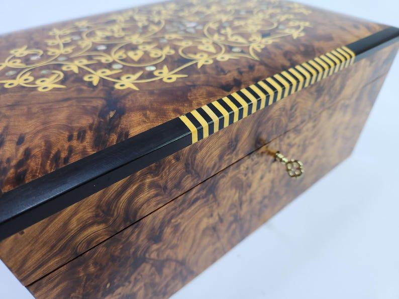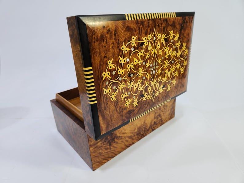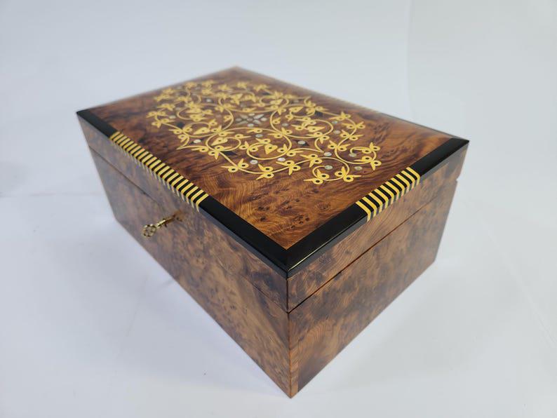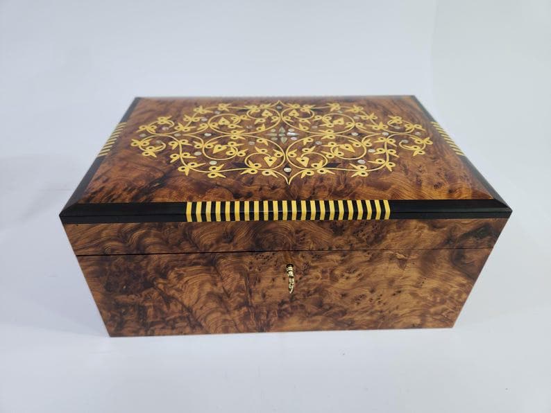 keepsake box — hand-inlaid with a golden floral arabesque and